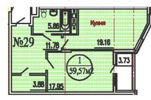 Однокомнатная квартира общей площадью 59,57 кв. м. позволяет с комфортом разместиться молодой семье из двух человек. Прихожая и коридор общей площадью почти 12 кв. м, лоджия 3,73 кв. м, кладовая 3,88 кв. м – есть где разместить шкафы и шкафчики для верхней одежды и различных предметов быта (типа лыж и пылесоса). Совмещенный почти 6-метровый санузел, солидное кухонно-гостиное пространство и очень приличная по размеру спальня. А если этого мало, можно объединить спальню с лоджией. В общем, тесниться не придется.