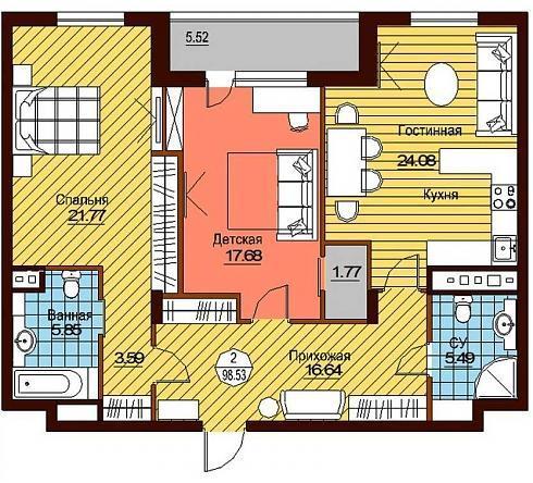 Двухкомнатная квартира общей площадью 98,53 кв. м дает возможность выделить отдельное жизненное пространство для ребенка, примерно 18 кв. метров, оборудовать просторную спальню для родителей, более 21 кв. м, и еще останется 16,5 на прихожую и 24 кв. м на кухню-гостиную. Диван в прихожей – разве не об этом вы мечтали? А хотите, поставьте его на лоджии, ее размер это вполне позволяет. Два раздельных санузла решат все бытовые проблемы на уровне потребностей.