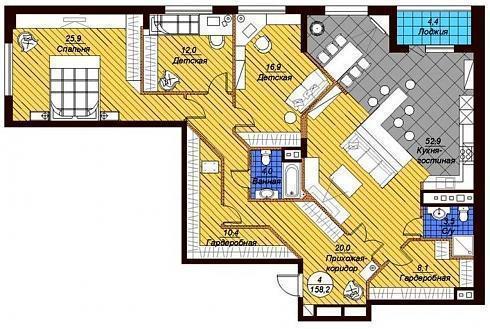 Четырехкомнатная квартира общей площадью 158,2 кв. м. предоставит в ваше распоряжение территорию, на которой вы легко сможете разметить два санузла, две гардеробные, три спальни, прихожую-коридор и кухню-гостиную почти в 53 кв. м. Есть, конечно, и лоджия. Наверное, этого хватит самому взыскательному новоселу.