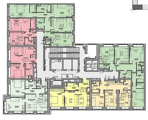 В секциях 1, 3 и 8, которые представляют собой башни, по 3 лифта, в остальных, шестиэтажных секциях – по два. В среднем на этаже 4-7 квартир (чаще всего 6).
