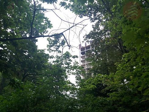 С северо-западной стороны лес примыкает к строящимся домам почти вплотную. Вот из-за ветвей можно разглядеть корпус 3.