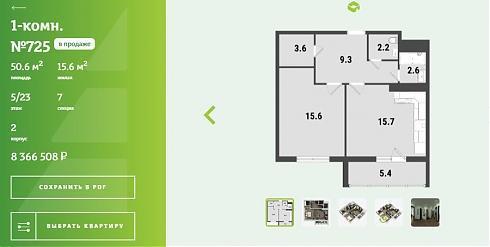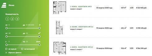 Есть довольно лаконичный, но удобный инструмент подбора квартир по параметрам. Кликнув на вариант, можно не только рассмотреть планировку, но и совершить «виртуальный тур» по квартире.