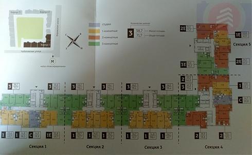 В каждой секции предусмотрено три лифта OTIS (два грузовых и пассажирский), на этаже от 4 до 7 квартир. Самые «населенные» – 5 и 6 секции второго корпуса.