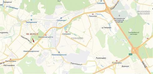 ЖК «Форест» строится рядом с Боровским шоссе, от МКАД до него всего пять километров по прямой. Если на дорогах обойдется без пробок, этот отрезок пути можно преодолеть минут за восемь.
