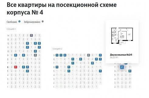 При клике на квартиру открывается планировка, информация об объекте, также предлагаются «похожие квартиры» (той же комнатности). Тут же можно посмотреть и шахматку корпуса.