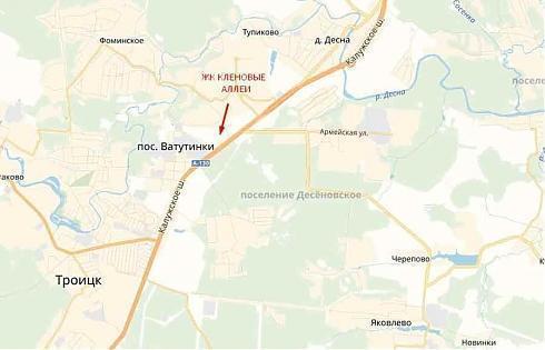 Проект ЖК «Кленовые Аллеи» принадлежит ГК «МИЦ». Комплекс возводится в Новой Москве (НАО) рядом с поселком Ватутинки, в 15 км от МКАД и всего в полутора километрах от Троицка. Новостройка, состоящая из 14 монолитных домов переменной этажности, будет включать в себя также два детских сада, школу, многоуровневый паркинг и торгово-развлекательный центр.