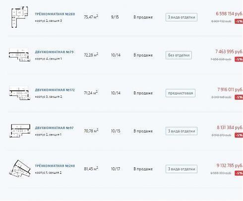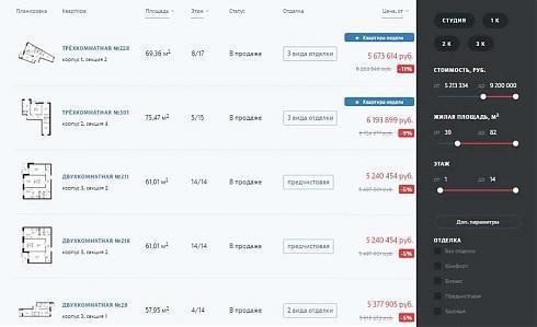 Выбор по параметрам тоже вполне удобный, в таблице выведены варианты сразу с планировками. Сортировать результаты можно по площади, этажу или цене.