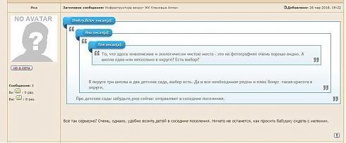 Самой полезной мне показалась тема об инфраструктуре окрестностей, с фотографиями и небольшой дискуссией. Но в целом, познавательным этот форум пока назвать сложно.