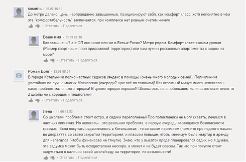 Изучение отзывов на других сайтах оставило довольно неоднозначные ощущения: с одной стороны, некоторые потенциальные покупатели довольны тем же, чем осталась довольна и я: транспортная доступность и близость торговых центров и парка. Претензии примерно такие же, как и у меня: оживленная автомагистраль не добавляет микрорайону тишины. Есть также отзывы о том, что детские сады и школы в окрестностях могут не выдержать «наплыва» воспитанников из новых «Котельнических высоток», но такие сведения, я полагаю, следует выяснять лично.