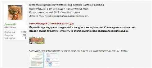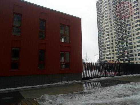 Детский садик на территории комплекса уже практически достроен, но пока не открыт. Правда, судя по сетованиям на форумах, открыть его планировалось вместе с введением в эксплуатацию домов первой очереди.