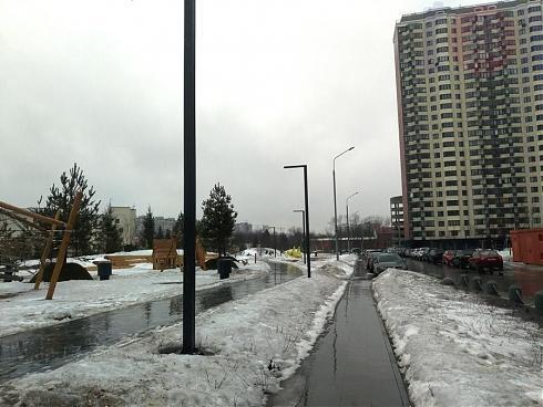 Поскольку на интересующих нас площадях 3 и 4 очередей вовсю идет строительство, представление о будущем облике этих кварталов приходится составлять по уже готовым дворам. И, что безусловно радует, дворы достаточно просторные. Жильцам не придется смотреть из собственных окон в окна дома напротив. Правда, из-за сугробов трудно понять, какие элементы благоустройства есть или будут на игровых площадках, когда сойдет снег. Но плитка на тротуарах положена неплохая, нескользкая, а вдоль домов есть своего рода газончики.