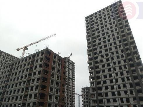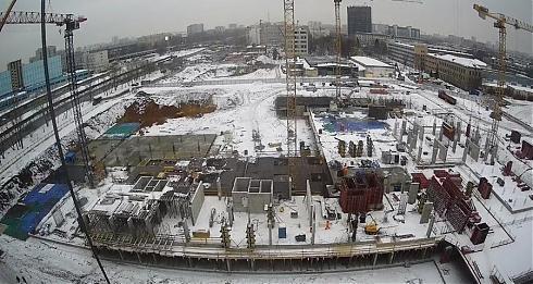 За одним из корпусов первой очереди виден строящийся многоуровневый паркинг.