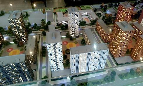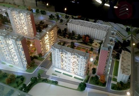 Составив представление об окрестностях новостройки, я решила наведаться в офис продаж и разузнать о домах и квартирах поподробнее. Сам Застройщик продажами квартир не занимается, делегировав эту функцию компаниям «Метриум» и «Бест-Новострой». В офисе вы можете рассмотреть макет всего комплекса и получить представление о том, что и когда будет построено. Вот так, например, выглядят первая и вторая очереди строительства. Два длинных приземистых белых здания (на фото справа и сверху) – паркинги, соответственно, семи и девяти этажей в высоту. Со слов менеджера, в течение года семиэтажный паркинг будет наконец достроен и введен в эксплуатацию. Сроки возведения второго пока точно не известны.