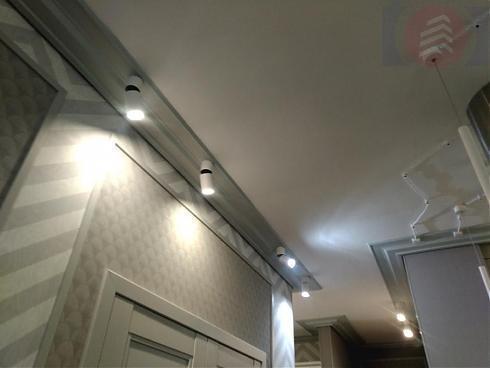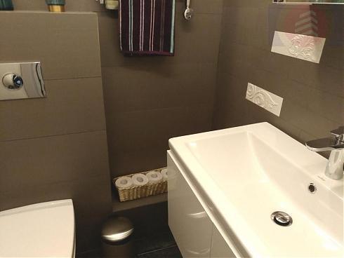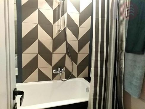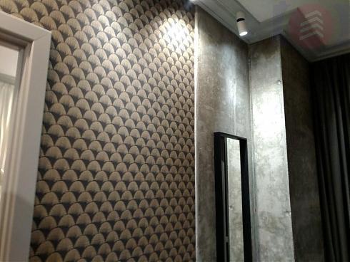 На полу – плитка и ламинат; обои – с различными геометрическими рисунками, по краю потолка размещены молдинги и точечные светильники. В санузлах – вся сантехника, электрические полотенцесушители, отделка плиткой.