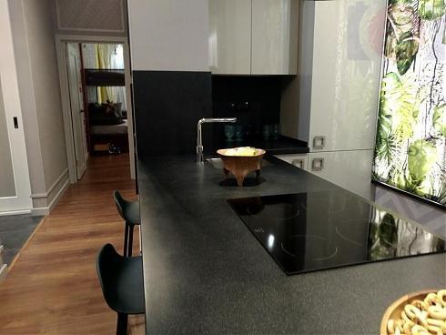 На кухне будут установлены холодильник, варочная панель и посудомоечная машина – а также, собственно, в «комплект» входит кухонный гарнитур.