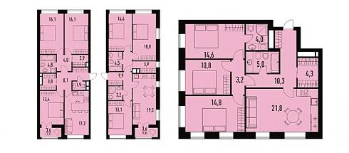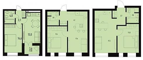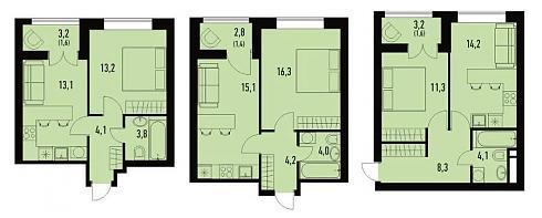 Выбор планировок довольно широкий, есть и совсем небольшие студии, и просторные трехкомнатные.
