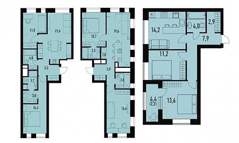 Планировок трехкомнатных квартир – три, из них две «распашонки». В каждом варианте – два полноценных санузла и гардеробные вполне приличных размеров.