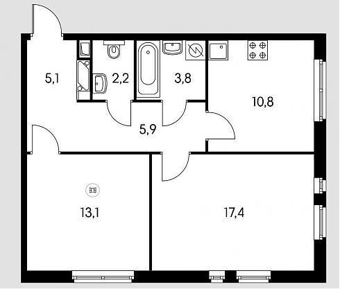 В двухкомнатной квартире раздельный санузел, просторная прихожая, большая кухня и достаточно просторная гостиная с двумя окнами площадью 17,4 кв. м. Спальня небольшая, но вполне приемлемая для создания атмосферы уюта и комфорта.