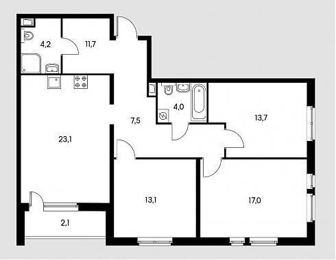В трехкомнатной квартире с комфортом смогут разместиться члены семьи из четырех человек. Три комнаты, одна из которых довольно большая, 17 кв. м, просторная кухня-столовая более 23 кв. м, две туалетные комнаты, большая прихожая и просторный коридор – места вполне достаточно и для отдыха, и для игр детей. Есть даже лоджия на кухне, хотя квартиры других форматов лишены этого «излишества». Чувствуется, что архитекторы решили отойти от идеи заселения граждан в жилье формата «смарт», где счет внутриквартирного пространства идет на сантиметры.
