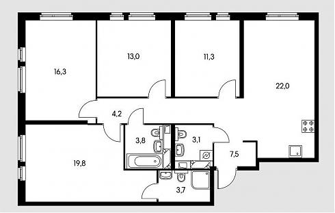 Очень просторная и удобная квартира с тремя туалетными комнатами и четырьмя жилыми комнатами, из которых самая маленькая 11,3 кв. м, а самая большая почти 20 кв. м. Прихожая и коридор общей площадью почти 12 кв. м. позволят установить достаточное количество шкафов, чтобы компенсировать отсутствие кладовки. Как недостаток можно отметить отсутствие лоджии или балкона, ведь есть люди, для которых возможность вдохнуть глоток свежего воздуха не выходя из квартиры принципиально важна.