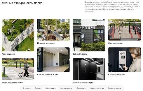 Дизайнеры сосредоточили внимание пользователей на преимуществах проекта, использовав панорамную съемку, видеоролики, выложили подборки рендеров внешнего вида зданий, дворовой территории и входных зон.