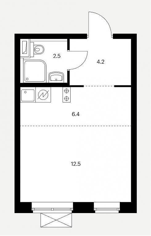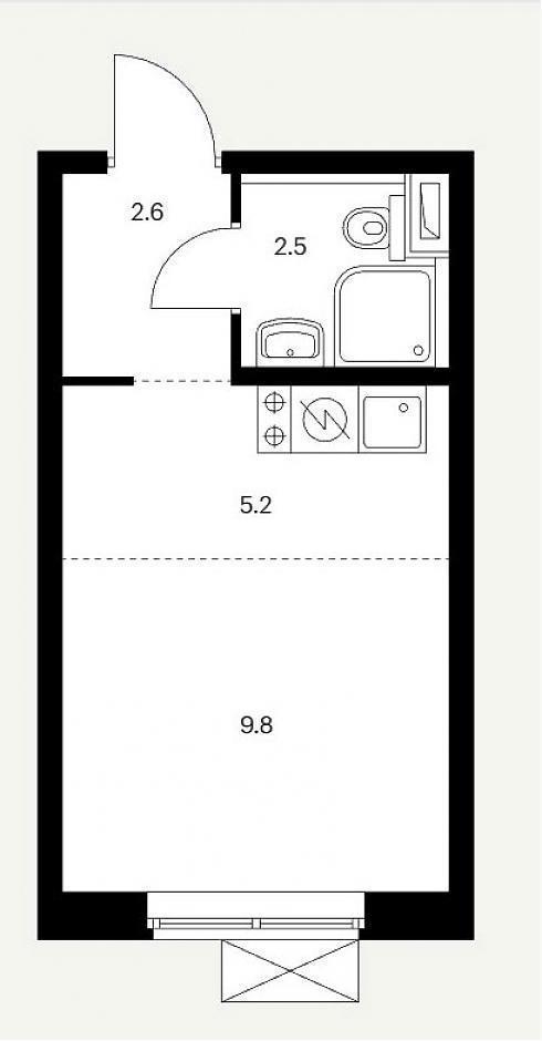 Квартиры студии запроектированы предельно минималистично. Входная зона площадью от 2,6 до 4,2 кв.м., совмещенный санузел площадью 2,5 кв.м., универсальное жилое помещение площадью от 15 ,0 до 18,9 кв.м.