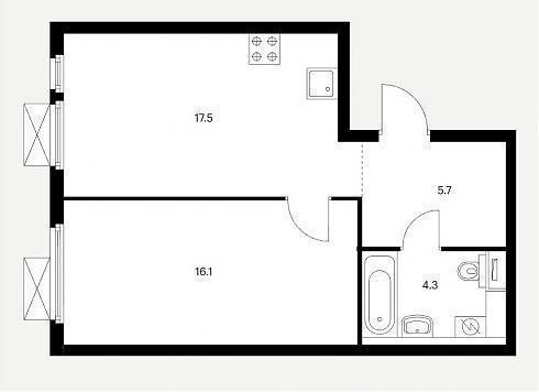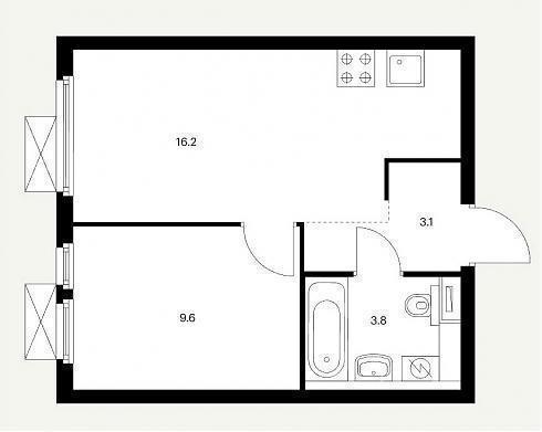 Однокомнатные квартиры располагают входной зоной площадью от 3,1 до 5,7 кв.м., совмещенным санузлом площадью от 3,8 до 4,3 кв.м., кухней площадью от 16,2 до 19,57 кв.м. и спальней площадью от 9,6 до 16,1 кв.м.