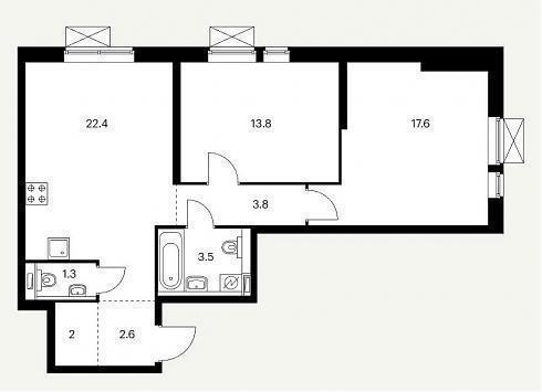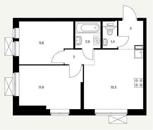 В двухкомнатных квартирах классического и евро-формата запроектирована входная зона площадью от 3,0 до 4,6 кв.м., один или два санузла с площадью помещений от 1,4 до 3,8 кв.м., кухня площадью от 15,3 до 22,4 кв.м. или кухня-гостиная площадью 16,4 кв.м., одна или две спальни площадью от 9,4 до 17,6 кв.м. Расположение комнат линейное или распашное, встречаются помещения с двумя окнами.
