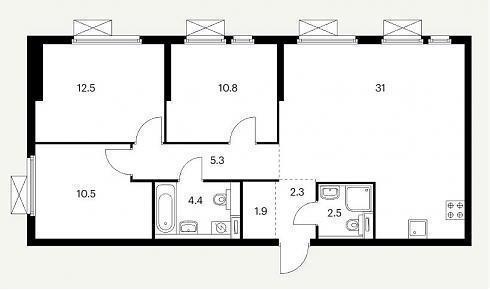 В трехкомнатных квартирах классического формата имеются входная зона от 4,0 до 13,9 кв.м (с учетом внутреннего коридора), два санузла с помещениями площадью от 1,3 до 4,4 кв.м., кухня площадью от 22,7 до 31,0 кв.м., три спальни площадью от 9,2 до 16 кв.м. Иногда встречаются гардеробные площадью 7,6 кв.м. Расположение комнат, угловое, в некоторых помещениях может быть два окна.