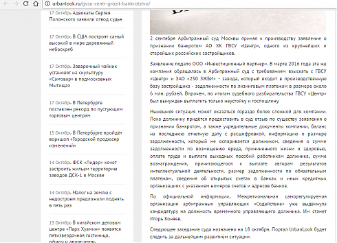 В марте 2016 года ООО «Инвестиционный партнер» обращалось в Арбитражный суд с требованием взыскать с ГВСУ «Центр» и ЗАО «250 ЗЖБИ» – завода, который входит в производственную базу застройщика – задолженности по лизинговым платежам в размере около 6 млн. рублей. Впрочем, по итогам судебного разбирательства ГВСУ «Центр» был вынужден выплатить только неустойку и госпошлину.