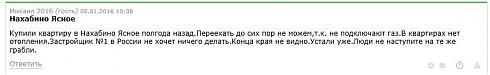 Теперь вернемся к проблемам первых поселенцев в ЖК. Первой очереди строительства в дома не дали газа, и люди зимовали в холодных квартирах без горячей воды. Вот здесь https://www.youtube.com/watch?v=-z3W4_HMdgs видеорепортаж, размещенный в ноябре 2015 года, в котором комплекс называют темным и холодным. Вот здесь, на форуме жильцов http://www.novostroykin.ru/forum/?pg=7&nid=3297, жалоба по поводу отсутствия газа в январе 2016 года. Сколько же не было газа в сданных в эксплуатацию домах? Газ начали давать только в марте 2016 года, не всем сразу, а постепенно, вот здесь репортаж об этом: https://www.youtube.com/watch?v=dgF3hUc9ddg. Все это после писем жителей в администрацию президента и вмешательства руководства администрации Истринского района.