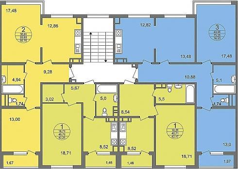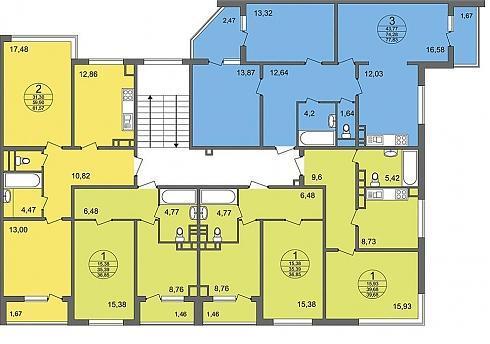 Планировки двухкомнатных квартир в ЖК я видела сама, остальные можно посмотреть на сайте. Они удобные, хотя в целом небольшие. Однокомнатные от 26 до 43 метров, двухкомнатные от 60 до 71 квадратного метра, трехкомнатные от 78 до 85 метров с большими кухнями и лоджиями.