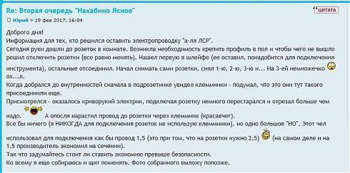 Кстати, если вы обратите внимание на адрес форума, то обнаружите, что у двух жилых комплексов («Нахабино Новое» и «Нахабино Ясное») общий форум, а «Нахабино ясное» обозначено как вторая очередь жилого комплекса «Нахабино Новое». Как мне объяснили в офисе продаж, сначала был построен микрорайон «Новое Нахабино», а там все дома трехэтажные. Квартиры так хорошо раскупались, что застройщик решил построить рядом еще один малоэтажный микрорайон ЖК «Нахабино Ясное». Дома строятся по той же технологии, а значит и проблемы в двух жилых комплексах общие.
