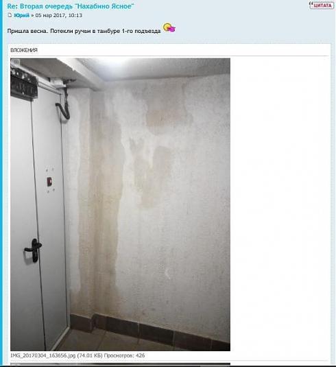 А весна принесла новые заботы: на форуме появились жалобы на то, что потекли крыши, причем отзывы эти снабжены фотографиями. Указаны, по крайней мере, два корпуса с протекающими крышами.