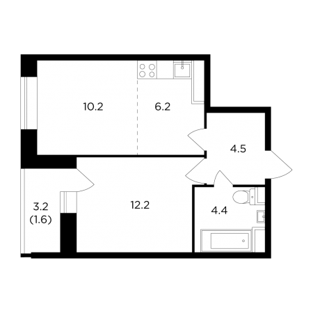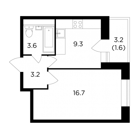 Студии находятся в самом невыгодном положении с точки зрения планировочного разнообразия. Спасибо, что не слишком маленькие, все-таки кухня-гостиная 16 кв.м. позволяет собственнику расправить плечи. Да и балкон 4 кв.м. дополнит ощущение «простора» (без кавычек тут, увы, не обойтись). Плюс прихожая и совмещенный санузел примерно одинакового размера. Все.
