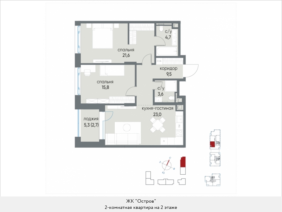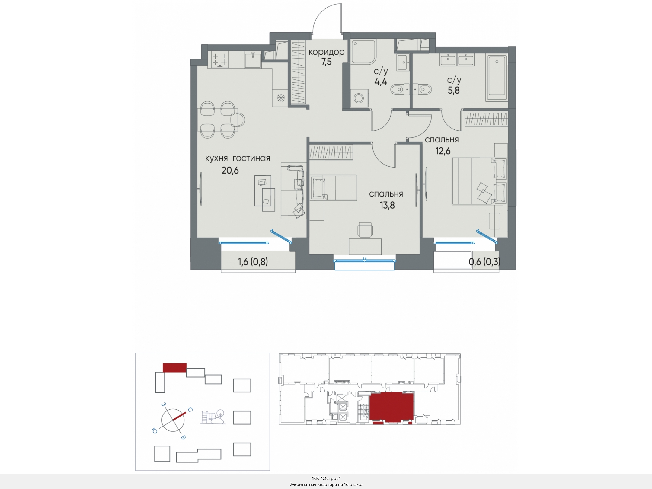 В двухкомнатных квартирах находим входную зону площадью от 4,7 до 7,8 кв.м., два санузла с площадью помещений от 2,0 до 4,9 кв.м., кухню площадью от 17,8 до 44,1 кв.м. и две спальни площадью от 11,1 до 16,5 кв.м. В некоторых вариантах планировки есть дополнительная комната (кабинет) площадью 12,9 кв.м. и хозяйственное помещение площадью 2,2 кв.м., есть мастер-спальни. Встречаются террасы площадью 31,7 кв.м. Расположение окон одностороннее и угловое, есть комнаты с двумя и тремя окнами.