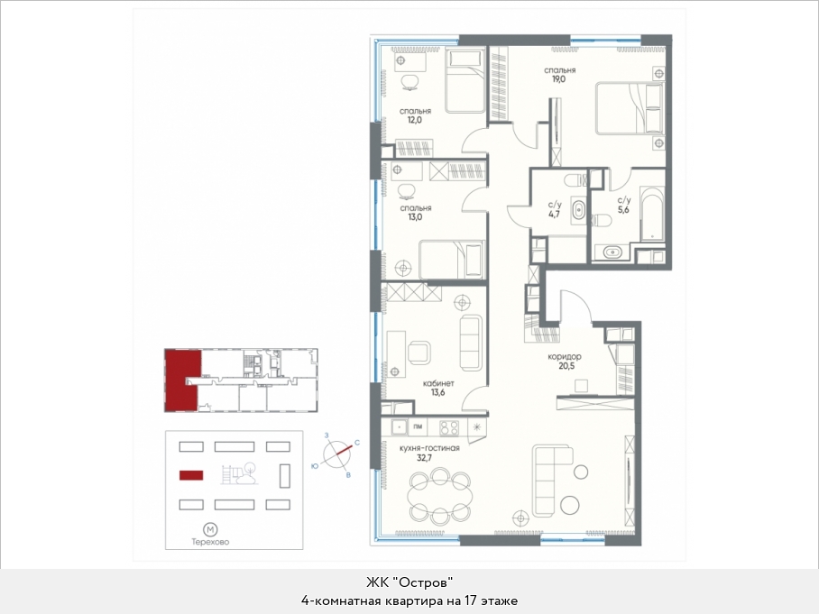 Четырехкомнатные квартиры, спроектированные в формате евро, располагают входной зоной площадью от 6,7 до 23,1 кв.м., тремя санузлами с площадью помещений от 3,8 до 8,5 кв.м., двумя или тремя спальнями площадью от 12,5 до 20,0 кв.м., кабинетом площадью от 10,0 до 14,5, а также одной, двумя или тремя гардеробными площадью от 3,9 до 10,4 кв.м. Встречаются постирочные площадью 3,1 кв.м., балконы или лоджии площадью от 0,6 до 6,4 кв.м., террасы площадью от 11,3 до 125,0 кв.м. Расположение окон угловое, двух- и трехстороннее, встречаются помещения с двумя и тремя окнами, имеются мастер-спальни и ванные с окном. В некоторых квартирах предусмотрена возможность установки камина.