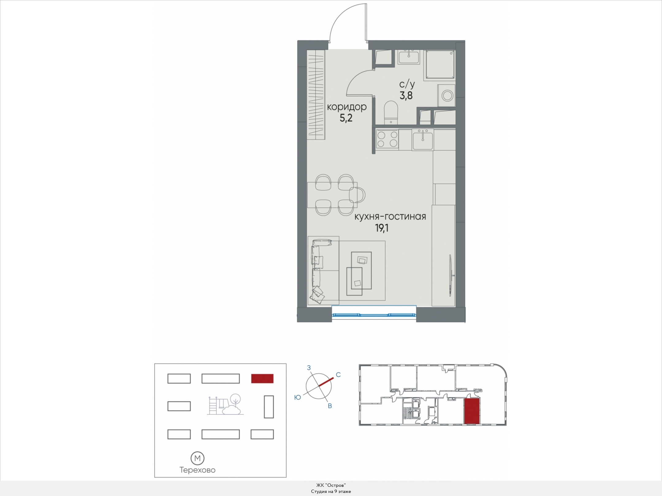 Студия спроектирована предельно просто. Входная зона площадью от 4,7 кв.м., совмещенный санузел площадью от 5,1 кв.м., универсальная комната площадью от 19,3 кв.м.