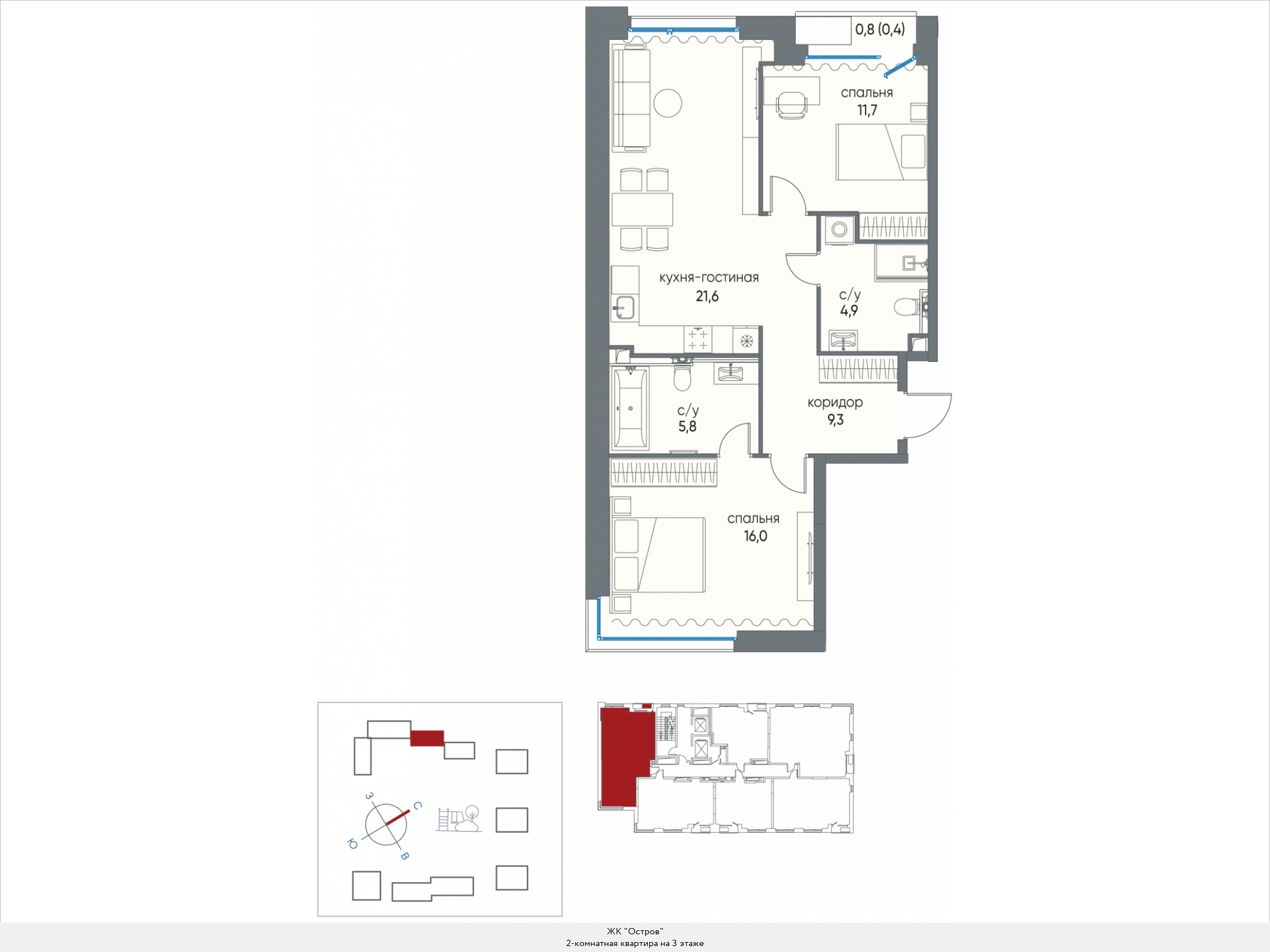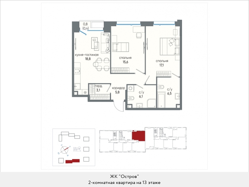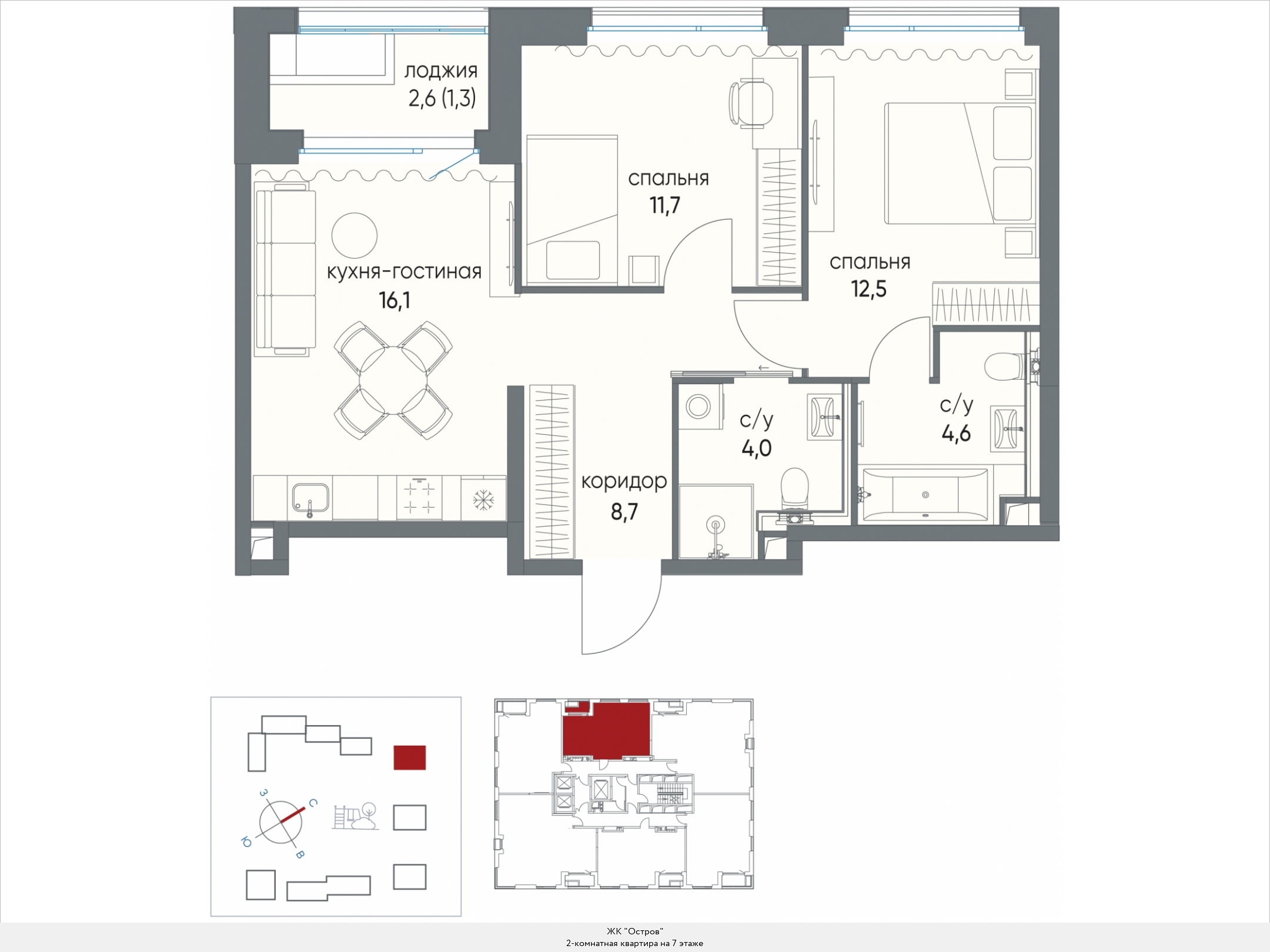 В двухкомнатных квартирах находим входную зону площадью от 4,7 до 7,8 кв.м., два санузла с площадью помещений от 2,0 до 4,9 кв.м., кухню площадью от 17,8 до 44,1 кв.м. и две спальни площадью от 11,1 до 16,5 кв.м. В некоторых вариантах планировки есть дополнительная комната (кабинет) площадью 12,9 кв.м. и хозяйственное помещение площадью 2,2 кв.м., есть мастер-спальни. Встречаются террасы площадью 31,7 кв.м. Расположение окон одностороннее и угловое, есть комнаты с двумя и тремя окнами.