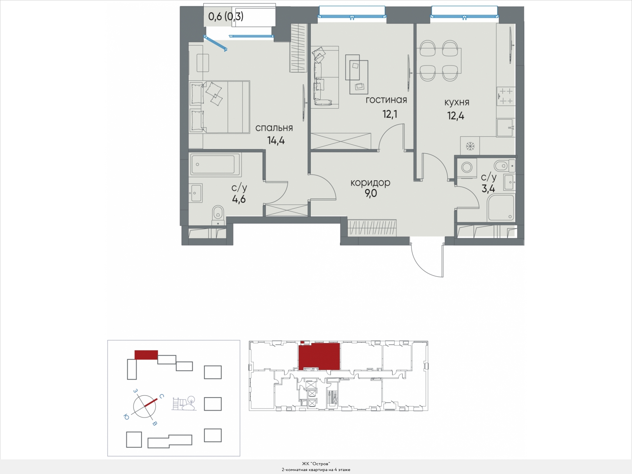 Четырехкомнатные квартиры, спроектированные в формате евро, располагают входной зоной площадью от 6,7 до 23,1 кв.м., тремя санузлами с площадью помещений от 3,8 до 8,5 кв.м., двумя или тремя спальнями площадью от 12,5 до 20,0 кв.м., кабинетом площадью от 10,0 до 14,5, а также одной, двумя или тремя гардеробными площадью от 3,9 до 10,4 кв.м. Встречаются постирочные площадью 3,1 кв.м., балконы или лоджии площадью от 0,6 до 6,4 кв.м., террасы площадью от 11,3 до 125,0 кв.м. Расположение окон угловое, двух- и трехстороннее, встречаются помещения с двумя и тремя окнами, имеются мастер-спальни и ванные с окном. В некоторых квартирах предусмотрена возможность установки камина.
