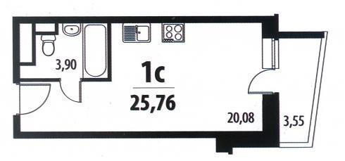 Миниатюрная квартира – студия представляет собой концентрированное жизненное пространство общей площадью 25,76 кв. м, из которых чуть больше 20 квадратов занимает кухня-гостиная (она же спальня), и почти 4 квадрата – совмещенный санузел. Есть небольшой балкон 3,55 кв. м (примите во внимание, что площадь балкона в общей площади квартиры исчисляется с коэффициентом 0,5).