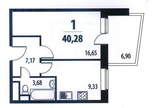 Однокомнатная квартира общей площадью 40,28 кв. м располагает довольно большой по площади кухней, довольно просторной спальней и прихожей, крохотным совмещенным санузлом. Есть балкон 6,9 кв. м, вполне достаточный, чтобы просушить белье и вечером полюбоваться видом на парк.