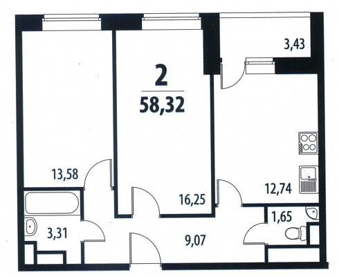 Двухкомнатная квартира общей площадью 58,32 кв. м располагает просторной прихожей чуть больше 9 кв. м, большой кухней, раздельным санузлом с очень небольшими помещениями и маленькими комнатами. Есть также небольшой балкон.