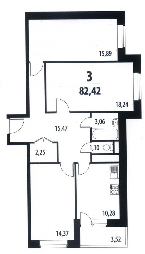 Трехкомнатная квартира общей площадью 82,42 кв. м сразу привлекает внимание гигантской прихожей, к которой примыкает еще и кладовка. Санузел раздельный, небольшой. Кухня средних размеров, комнаты от 14 до 18 кв. метров.