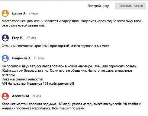 Комплекс начали заселять еще в 2015 году, поэтому в интернете достаточно много отзывов от владельцев квартир, большинство из них положительные. Людям нравится место расположения домов, их красивый и нестандартный внешний вид, удобное транспортное сообщение с Москвой. Впрочем, есть и негативные отклики. Некоторые собственники жалуются на плохую работу управляющей компании, отмечают ситуации с затяжкой сроков сдачи домов, опасаются недостатка парковочных мест после завершения всех строительных работ и полного заселения жилых домов.