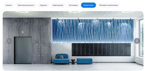 Фасады оснастят сертифицированной фасадной системой с отделкой из керамической или бетонной плитки. Входные группы на уровне земли с двумя входами и дизайнерской отделкой в голубых тонах создадут комфорт и удобство сразу после входа в здание. В лобби предусмотрены помещения для колясок и велосипедов.