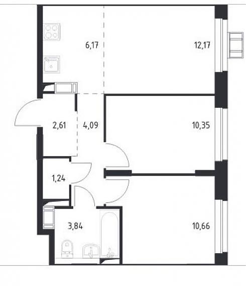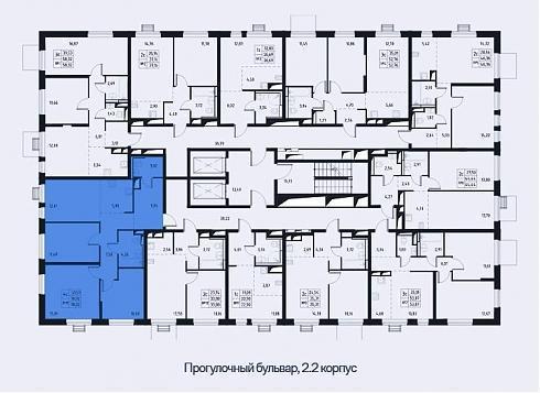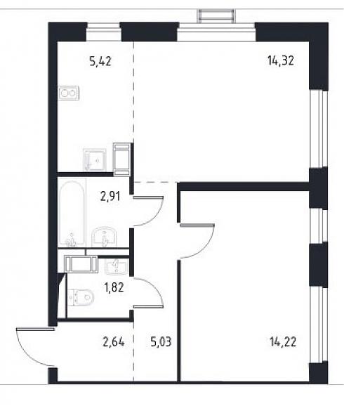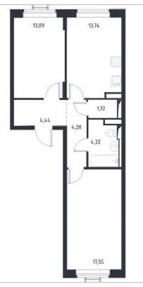 Двухкомнатные квартиры спроектированы в двух форматах – евро и классика. Входная зона площадью от 4,24 до 8,72 кв.м (с учетом внутреннего коридора). Один или два санузла с площадью помещений от 1,82 до 4,32 кв.м. Кухня - гостиная площадью от 19,74 до 20,96 кв.м. и классическая кухня площадью 13,74, одна или две спальни площадью от 9,31 до 17,55 кв.м. В некоторых вариантах планировки встречается кладовая площадью 1,72 кв.м. Расположение комнат угловое, одно- и двухсторонее, есть помещения с двумя или тремя окнами.