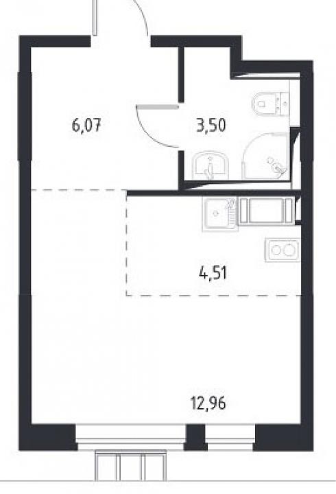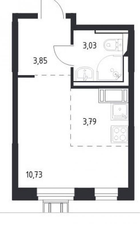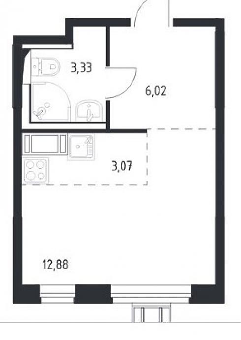 Студии спроектированы очень лаконично. Входная зона площадью от 3,85 до 6,07 кв.м., совмещенный санузел площадью от 3,03 до 3,5 кв.м., многофункциональное помещение площадью от 14,52 до 17,35 кв.м.