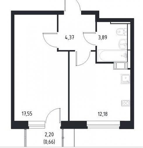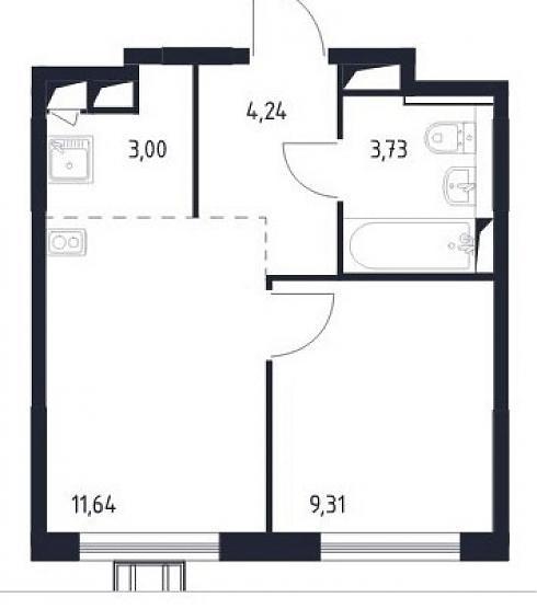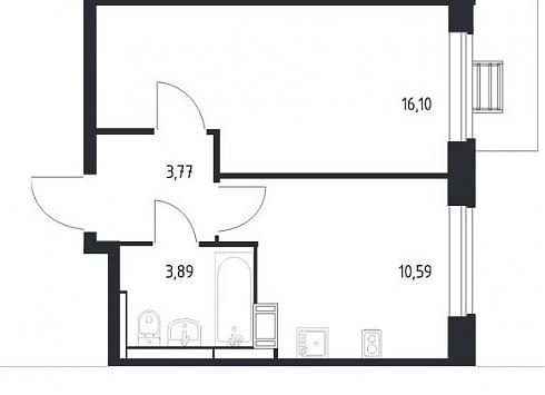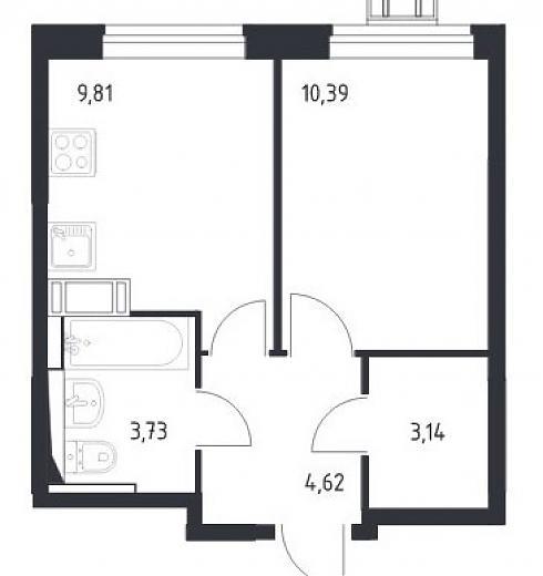 Однокомнатные квартиры располагают входной зоной площадью от 3,77 до 4,62 кв.м., совмещенным санузлом площадью от 3,73 до 3,89 кв.м., кухней площадью от 9,81 до 12,18 кв.м. и спальней площадью от 10,39 до 17,55 кв.м. Никакого евро, только классика. Встречается балкон площадью 2,2 кв.м.
