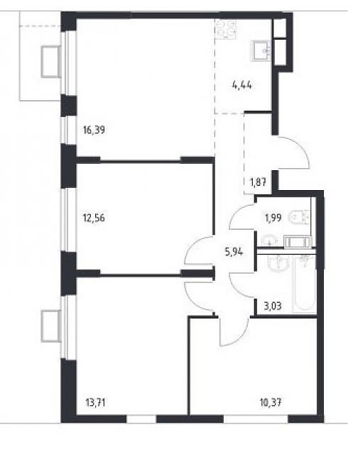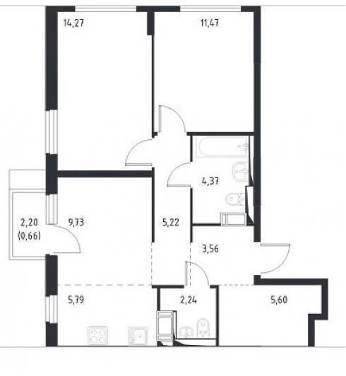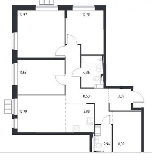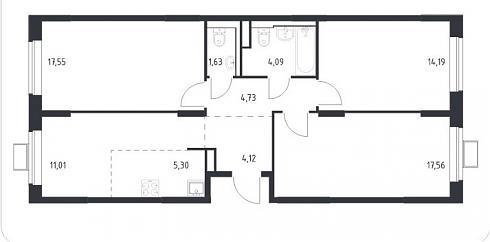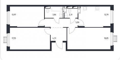 Площадь входной зоны трехкомнатных квартир от 6,7 до 10,07кв.м. с учетом внутреннего коридора. Один или два санузла с площадью помещений от 2,24 до 4,37кв.м. В квартире классической планировки кухня площадью12,79кв.м., а в евро-формате кухня-гостиная площадью от 15,5 до 18,34 кв.м. Две или три спальни площадью от 10,35 до 18,85кв.м. Есть гардеробные площадью от 1,24. Встречается балкон площадью 2,2 кв.м. Квартиры односторонние, угловые и распашные, есть помещения с двумя окнами.